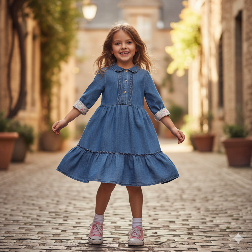 La robe Mona Lisa habille les petites filles avec style et douceur. En denim upcyclé et 100 % fabriquée en France, elle allie durabilité, confort et modernité.